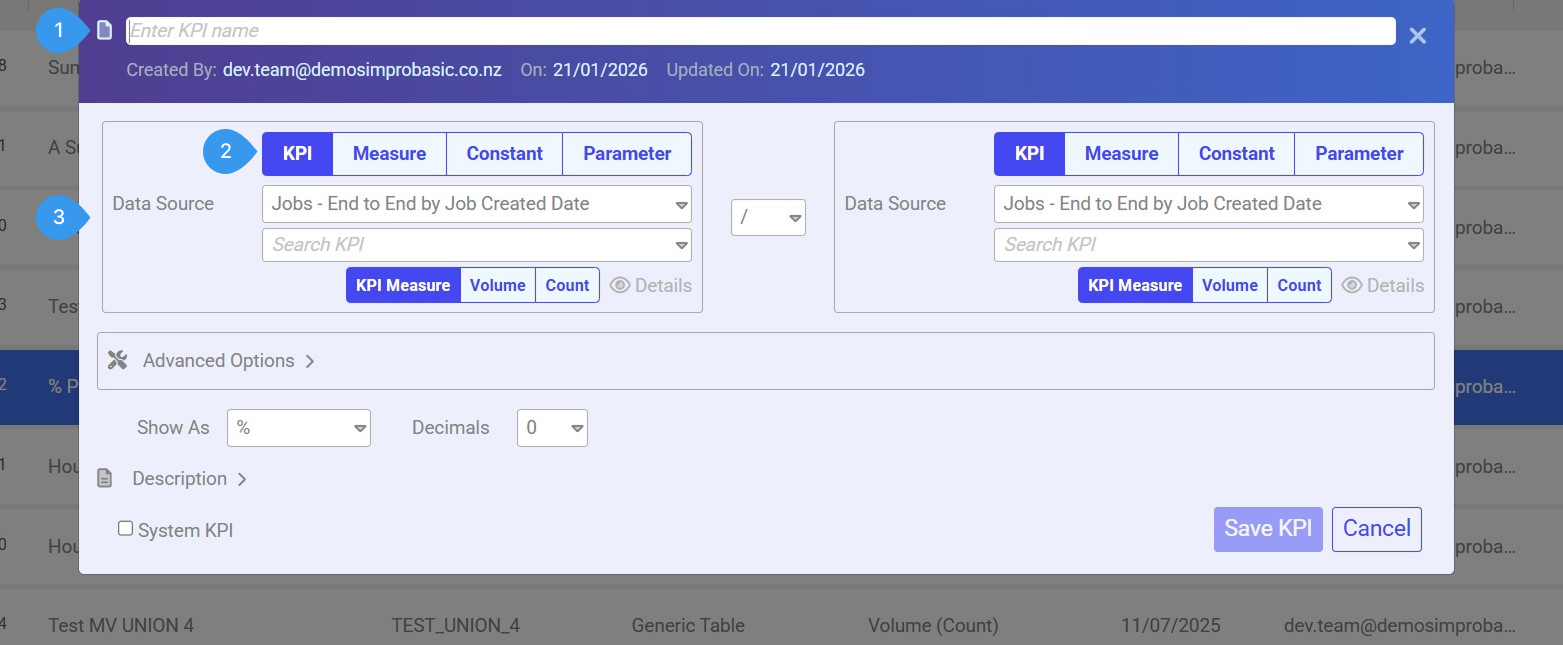 Name the KPI (1), select the Datasource (2) and the KPI Measure(3)
